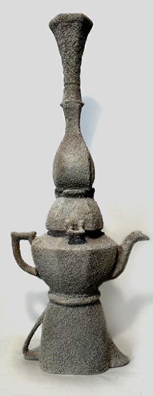 SERIE: ESAS PARTÍCULAS DE POLVO TAMBIÉN SON CUERPO. Escultura. Objetos cotidianos de cerámica y vidrio cubiertos de polvo volcánico blanco. 69 x 28 x 20 cm 2025
